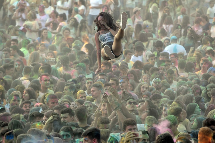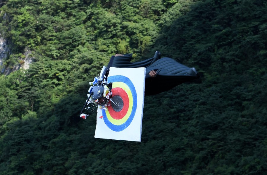 Read moreThis photo shows a wingsuit flyer hitting a foam target during the 6th Carabao World Wingsuit Championship on Tianmenshan mountain in Zhangjiajie in China's central Hunan province, on September 11, 2017. #