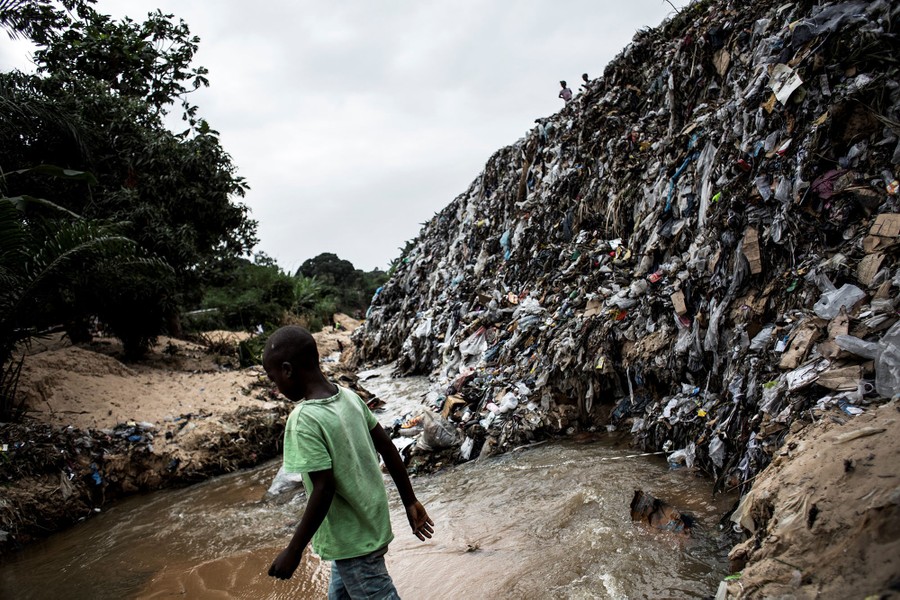 Read moreA young boy walks across a dirty river, with its banks littered with garbage, in the Ngaliema neighborhood of Kinshasa, Democratic Republic of the Congo, on September 12, 2017. #