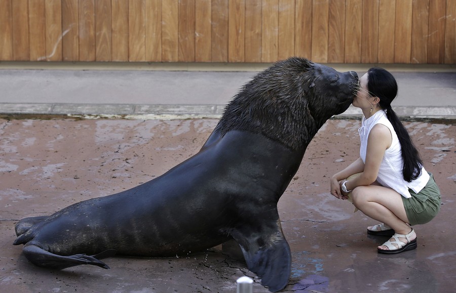Read moreA sea lion kisses a visitor during a sea animal show at the Hakkeijima Sea Paradise aquarium-amusement park complex in Yokohama, southwest of Tokyo, Japan, on September 11, 2017. #