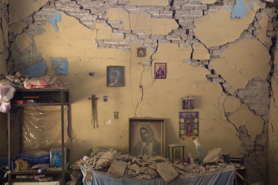 Read moreAn altar to the Virgin of Guadalupe is covered with fallen debris inside the earth-damaged home where Larissa Garcia, 24, lived with her family in Juchitan, Oaxaca state, Mexico, on September 9, 2017. The family was caught under rubble when the house partially collapsed, leaving Garcia with a broken arm and her father with a head injury. Her mother, who had to be pulled out from underneath a foot-thick section of wall that collapsed on her back, remains in a wheelchair and unable to walk. #
