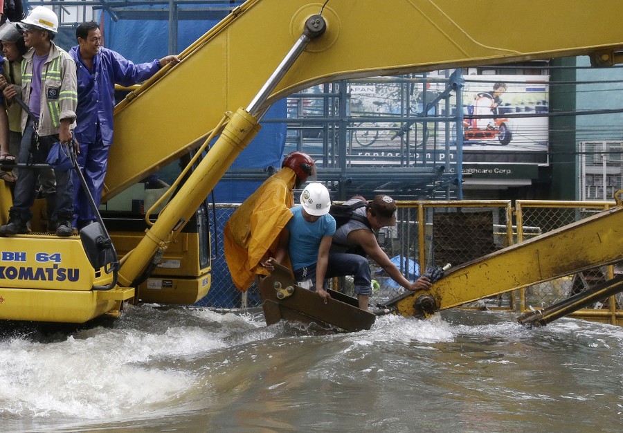Read moreFilipino workers try to keep dry as they ride on a backhoe while crossing a flooded street in Manila, Philippines, on September 12, 2017. Classes in schools and work in government offices have been suspended in the capital and nearby provinces as heavy rains pour causing floods in low-lying areas due to Tropical Depression Maring. #