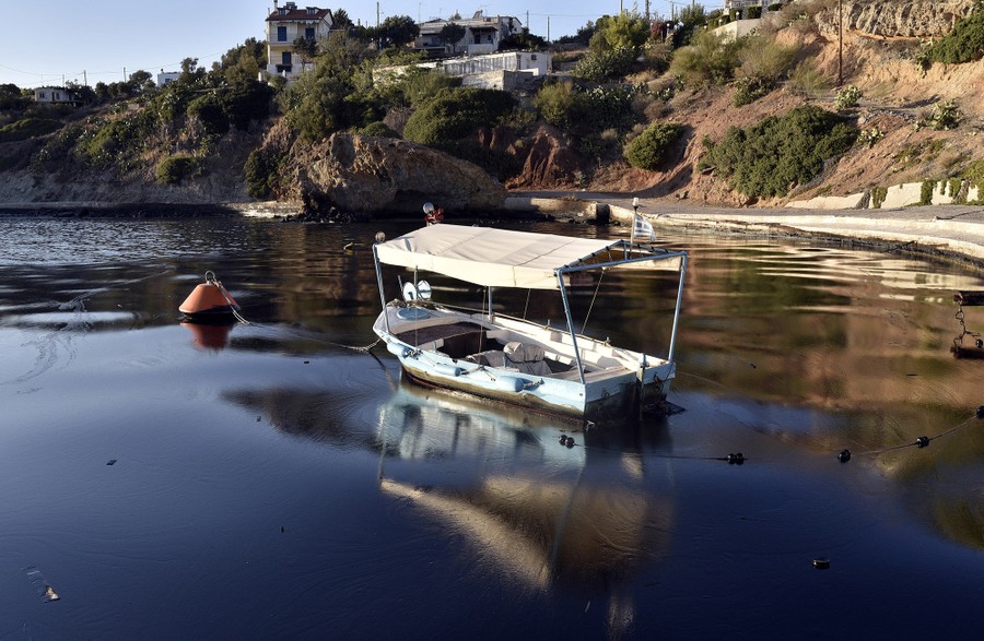 Read moreA boat floats in an oil-fouled bay on the coast of Salamis Island, in Salamis, Greece, on September 13, 2017. The small tanker "Agia Zoni II" sank on September 10, while anchored off the coast of Salamis, near Greece's main port of Piraeus. It was carrying a cargo of 2,200 tons of fuel oil and 370 tons of marine gas oil. The island has suffered heavy pollution as a result in what has been called a "major environmental disaster" by officials. #
