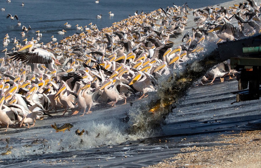 Read moreIsraeli farmers feed fish to great white pelicans at a reservoir in Mishmar HaSharon, north of the Israeli city of Tel Aviv, on October 15, 2017. Thousands of migrant pelicans pass though Israel on their way to Africa and when they return to Europe in the summer. Local farmers feed the birds in order to avoid damage to the commercial fish pools. #