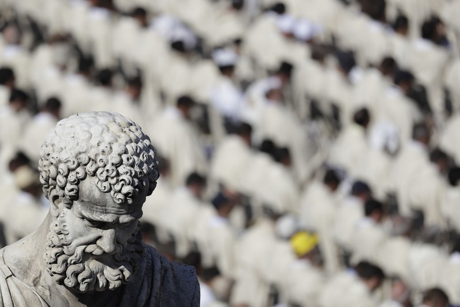 Read moreThe statue of St. Peter towers over prelates attending a mass celebrated by Pope Francis for the canonization of 35 new saints, in St. Peter's Square at the Vatican on October 15, 2017. #