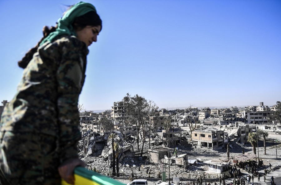 Read moreA female fighter of the Syrian Democratic Forces looks at the iconic Al-Naim square in Raqqa, Syria, surrounded by war-damaged buildings, on October 19, 2017, after retaking the city from ISIS fighters. SDF fighters flushed jihadist holdouts from Raqqa's main hospital and municipal stadium, wrapping up a more than four-month offensive against what used to be the inner sanctum of the Isalmic State's self-proclaimed "caliphate". #