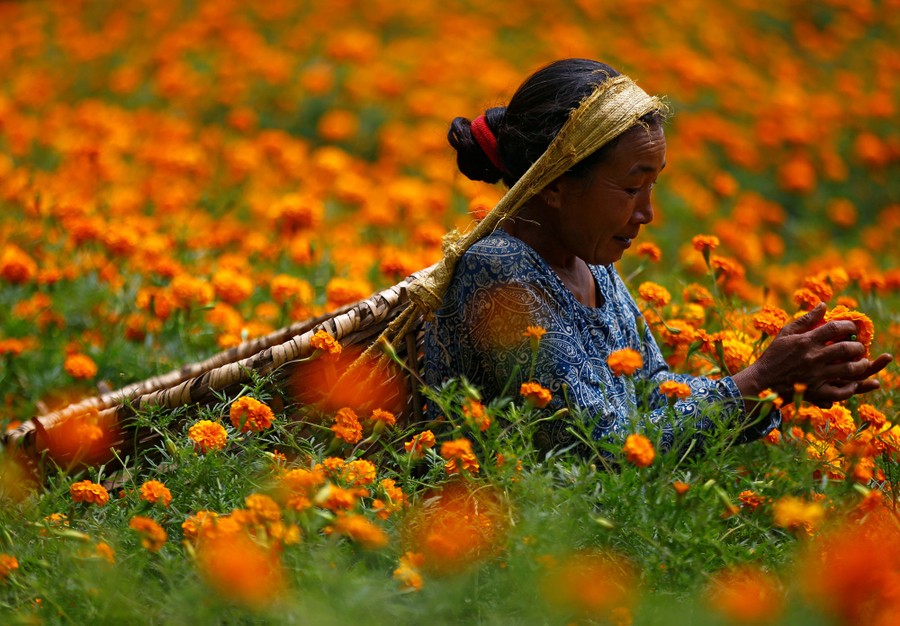 Read moreA woman picks marigold flowers used to make garlands and offer prayers, before selling them to the market for the Tihar festival, also called Diwali, in Kathmandu, Nepal, on October 17, 2017. #