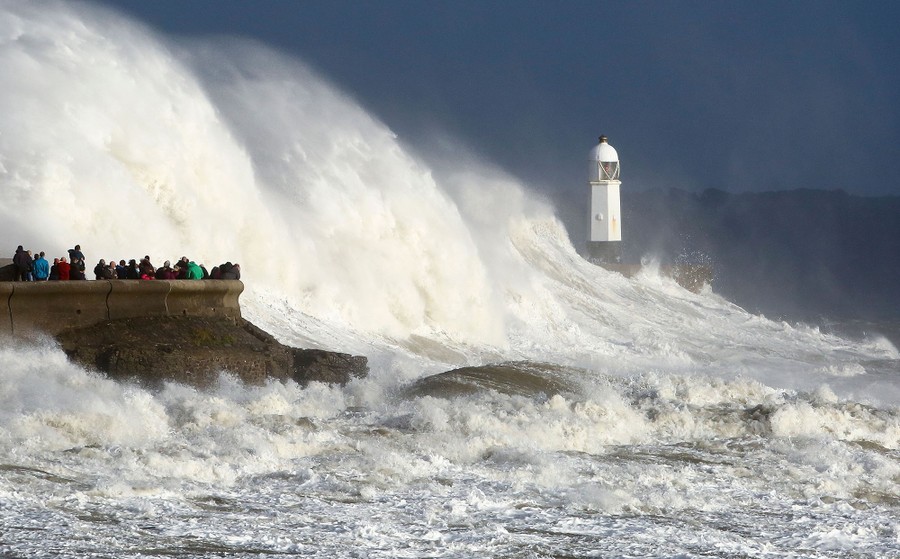 Read moreHuge waves strike the harbor wall and lighthouse at Porthcawl, South Wales, on October 16, 2017, as Storm Ophelia hit the UK and Ireland. Ireland was hit by the "unprecedented storm" on Monday that left two people dead, 120,000 homes and businesses without power and closed every school in the country. #