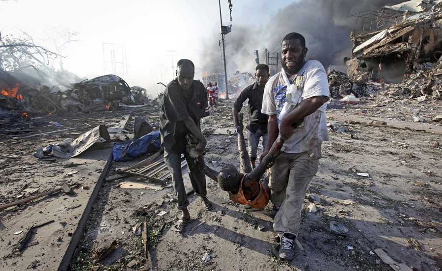 Read moreSomalis remove the body of a man killed in a blast in the capital city of Mogadishu, Somalia, on October 14, 2017. Huge explosions from a pair of truck bombs killed at least 327 people and injured nearly 400 police said. The attack was the deadliest in Somalia's history, and has shaken and angered thousands across the country, in some cases leading to an urgent and growing sense of unity and solidarity. #