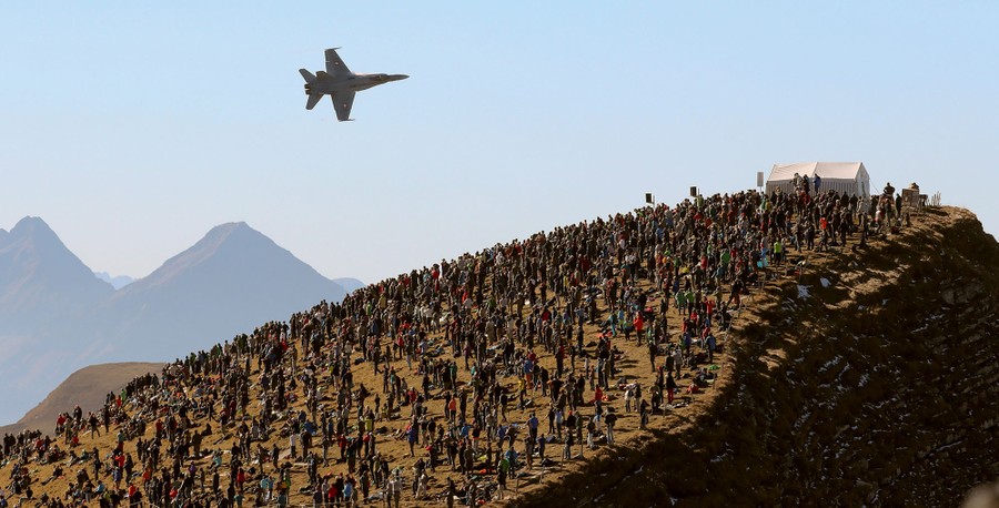 Read moreA Swiss Air Force F/A-18 Hornet fighter aircraft flies past spectators during a flight demonstration of the Swiss Air Force over the Axalp in the Bernese Oberland, Switzerland, on October 12, 2017. #