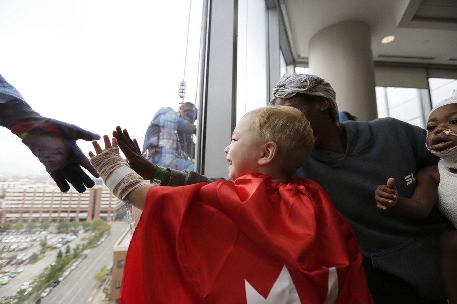 Read moreBettina Billups, right, helps Brentley Lashum, 2, touch Superman's hand during superhero window washing day at Children's of Alabama, as part of the hospital's Superhero Month celebrations, on October 11, 2017, in Birmingham, Alabama. #