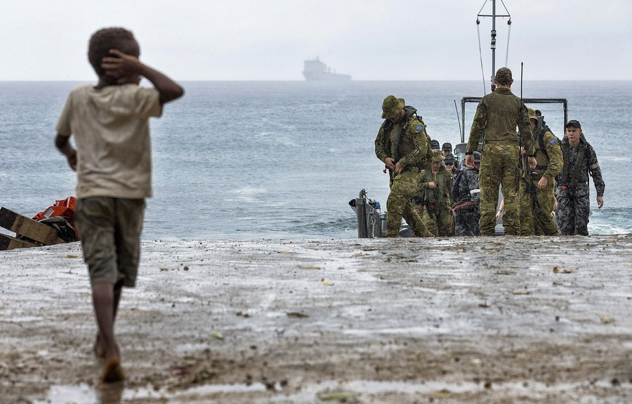 Read moreA local boy watches Australian Army soldiers and Australian Navy soldiers from HMAS Choules arrive to help deliver supplies and assist those affected by the Marano Voui volcano, on Vanuatu's Pentecost Island on October 8, 2017. #