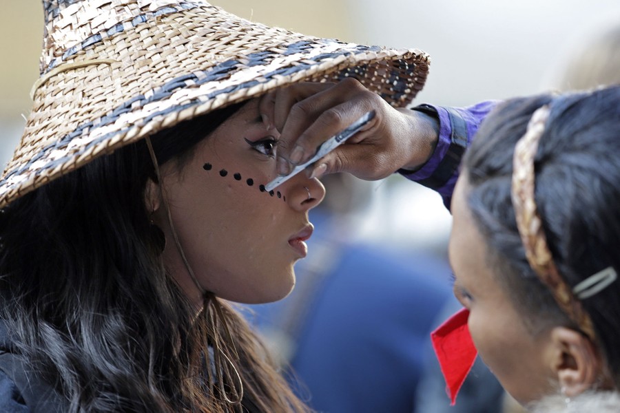 Read moreMercedes Quintana-Diaz, of Tlingit and Tsimshian tribes, has dots pained on her face, symbolizing a rite of passage for young Native American women, during an Indigenous Peoples' Day event on October 9, 2017, in Seattle, Washington. In 2014, the Seattle City Council voted to stop recognizing Columbus Day and instead turned the second Monday in October into a day of recognition of Native American cultures and peoples. #