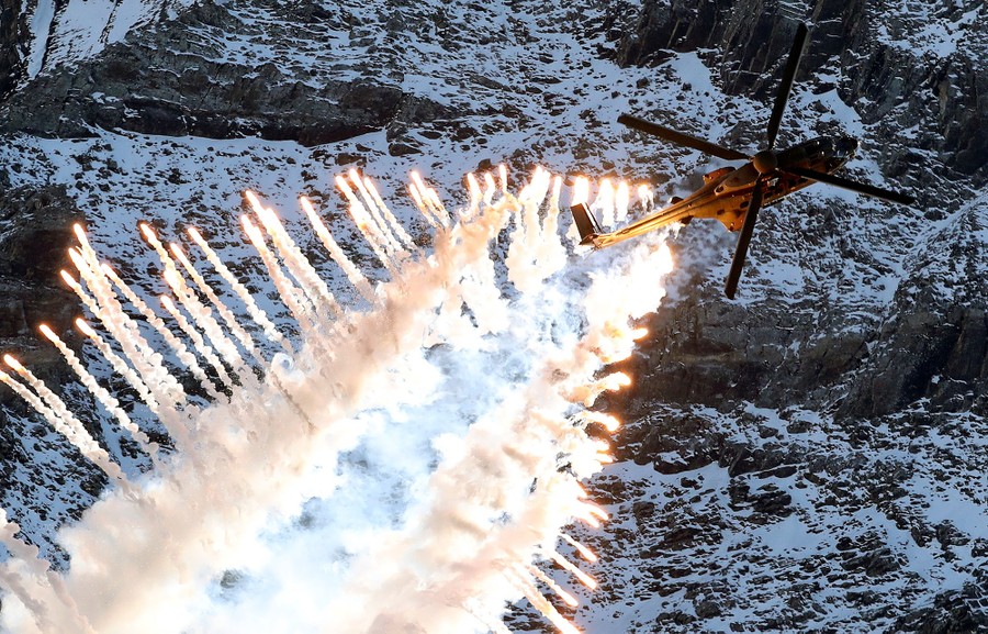 Read moreA Swiss Air Force Super Puma/Cougar helicopter releases flares during a flight demonstration of the Swiss Air Force over the Axalp in the Bernese Oberland, Switzerland, on October 12, 2017. #