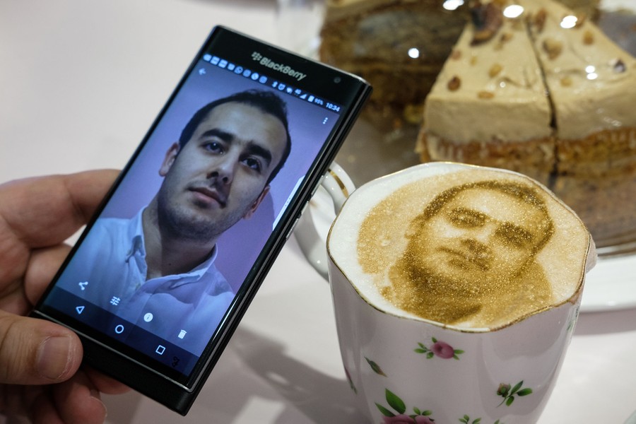 Read moreA man compares a photo on his phone to a coffee depicting his image at The Tea Terrace in the House of Fraser department store in London, England, on December 21, 2017. For £5.75 ($7.69 USD), customers can send a photo to the barista, who then applies the image to the foam of the coffee using edible food dye from a fine art printer. #