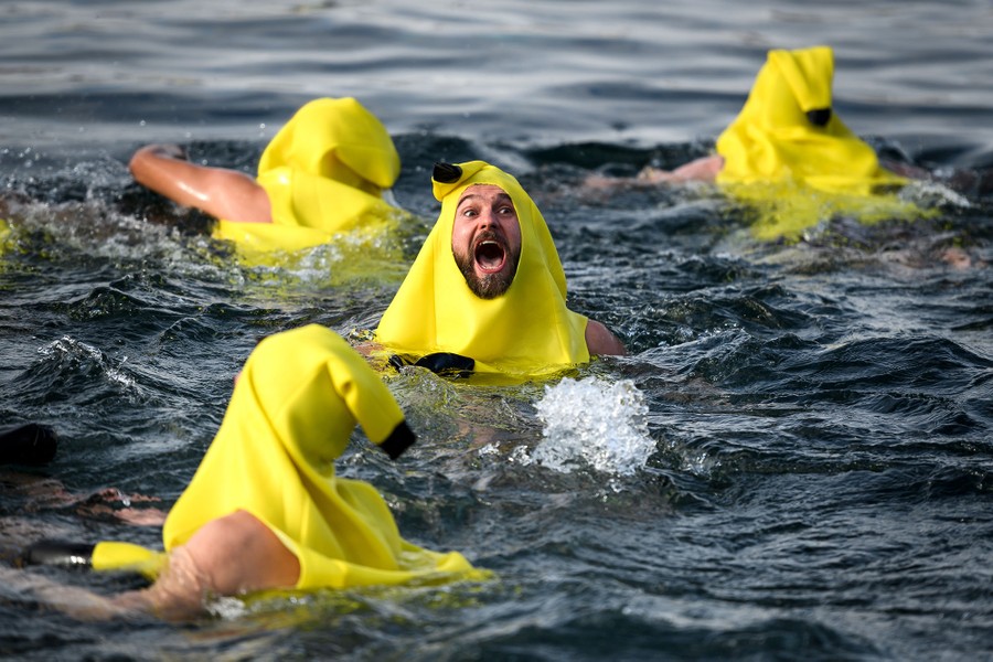 Read moreSwimmers in banana suits dive into Lake Geneva during the 79th Coupe de Noel (Christmas cup) swimming race on December 17, 2017, in Geneva, Switzerland. More than 2,000 participants took part in the event, a 120-meter-long swim off Geneva's banks into the 6.1 degrees Celsius (41 degrees Fahrenheit) water. #