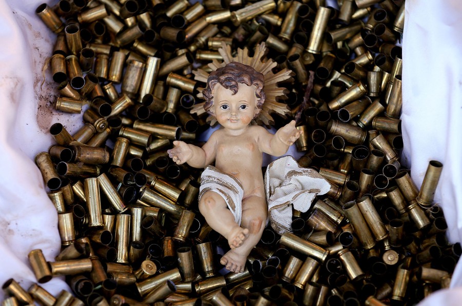 Read moreA small statue of baby Jesus lies in a bed of bullet shells in a nativity scene outside the Basilica of St Francis in Assisi, Italy, on December 21, 2017. The 445 shells represent the number of priests, nuns, monks, and religious teachers killed for their faith since 2000. #