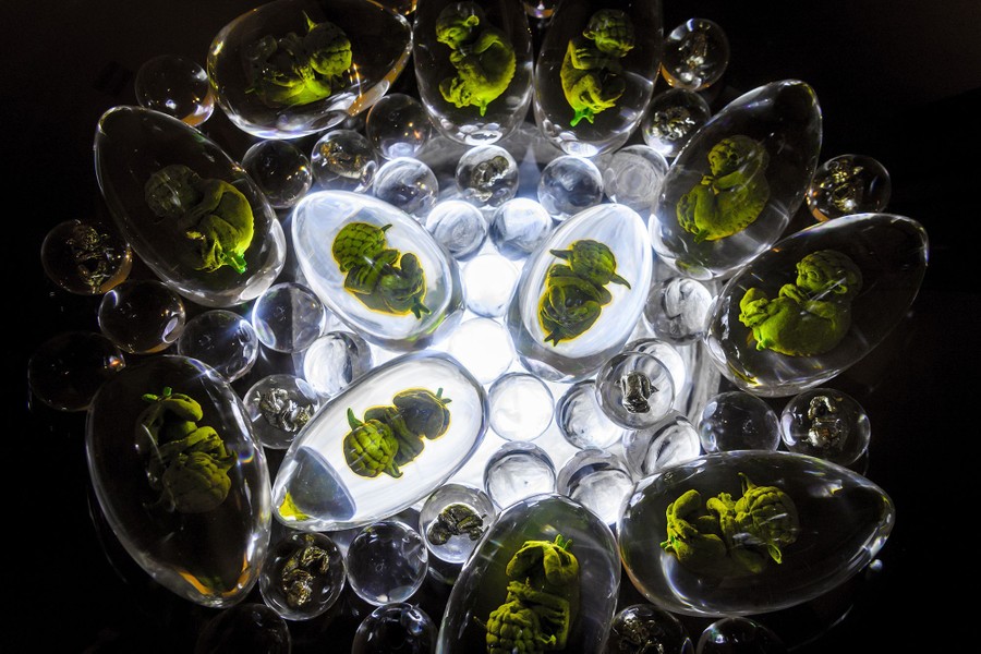 Read moreA photo shows the work Eggs of Yodafoetus by French artist Alexandre Nicolas at the science fiction museum Maison d'Ailleurs (translated as "House of Elsewhere") during the exhibition entitled "I Am Your Father!" on December 21, 2017, in Yverdon-les-Bains, Switzerland. The museum presents the works of thirteen contemporary international artists who use the Star Wars myth to elicit different perspectives, including the relationship between reality and fiction or the making of myths and idols, until October 14, 2018. #