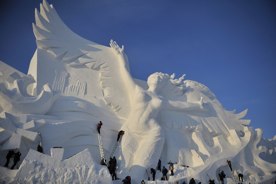 Read moreWorkers carve the main sculpture Snow Song Winter Olympics for the 30th Harbin Sun Island international Snow Sculpture Art Exposition on December 12, 2017 in Harbin, China. The 30th Harbin Sun Island International Snow Sculpture Art Exposition runs from December 20, 2017 through February 28, 2018. #