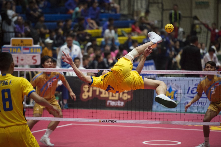 Read moreA sepak takraw player from Thailand roll spikes the ball over the net against Singapore during the King's Cup Sepak Takraw World Championship in Bangkok on December 14, 2017. #