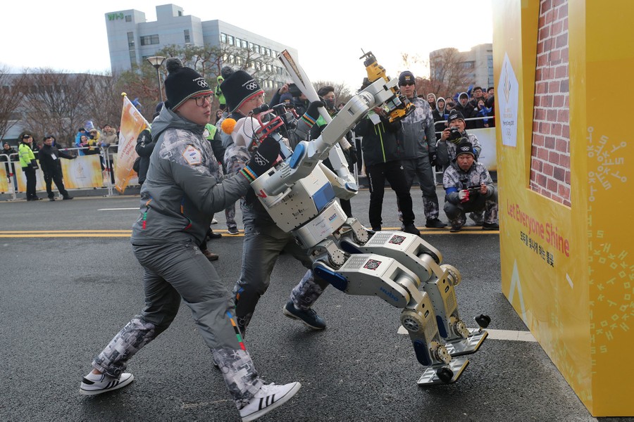 Read moreHUBO, a multifunctional walking humanoid robot, gets help as it loses its balance while carrying the Olympic torch at the Korea Advanced Institute of Science and Technology in Daejeon, South Korea, on December 11, 2017. #