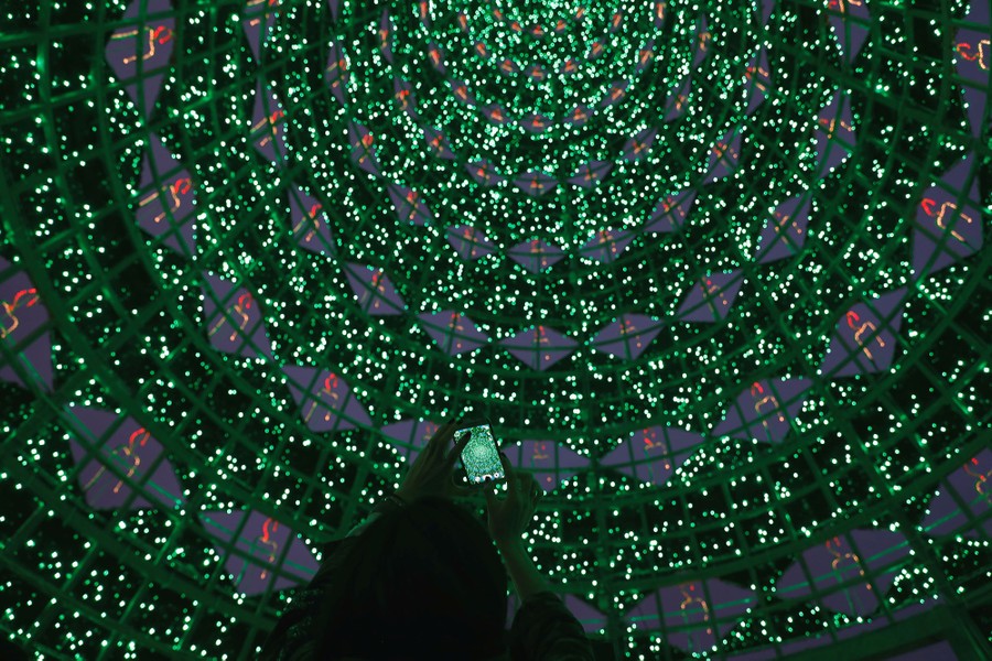 Read morePeople walk past a sculpture titled "Empty Bundle" by the artist Yang Tao, as a ray of sunlight hits it at an upscale shopping mall in Beijing, on December 13, 2017. #