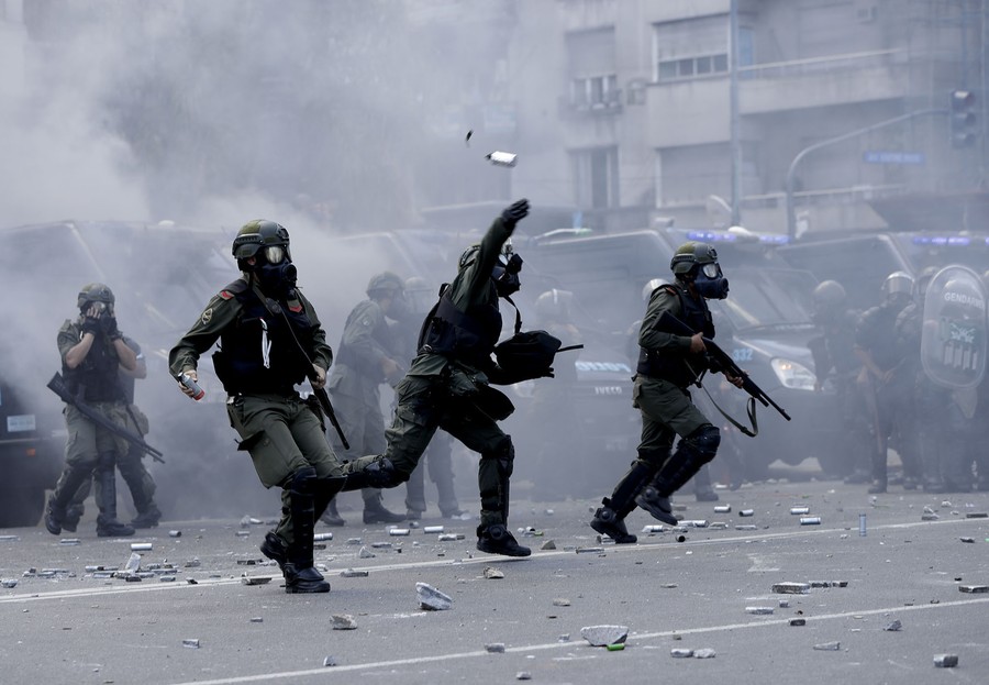 Read morePolice launch tear gas canisters at stick-wielding protesters who hauled rocks and torched several garbage bins outside the Congress building and in nearby streets, in Buenos Aires, Argentina, on December 14, 2017. Argentine police clashed Thursday with demonstrators protesting reforms to the retirement and pension system. #