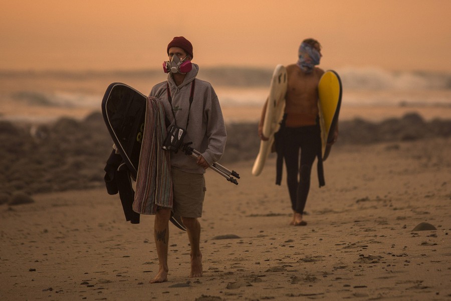 Read moreA smoke-filled sky filters orange light around surfers as the Thomas Fire continues to grow and threaten communities from Carpinteria to Santa Barbara on December 12, 2017 in Carpinteria, California. #