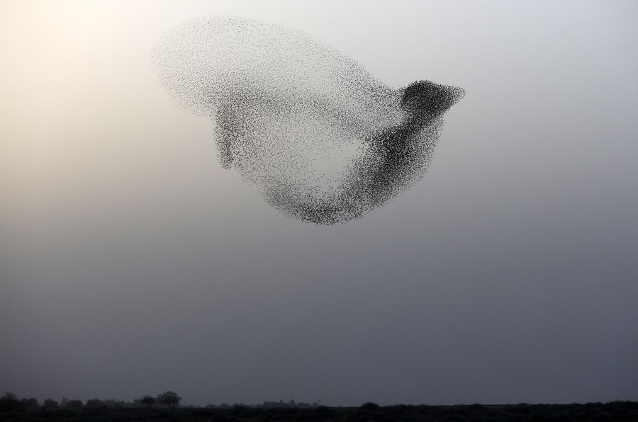 Read moreA photo taken on January 22, 2018, shows a bird-shaped murmuration of starlings before they land to sleep near the southern Israeli city of Rahat in the Negev desert. #
