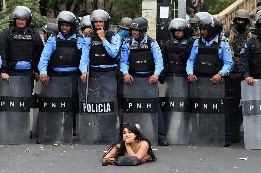 Read moreA supporter of Salvador Nasralla, the presidential candidate for the Honduran Opposition Alliance Against the Dictatorship for the past election, lies on the street in front of police officers during a demonstration against the contested re-election of President Juan Orlando Hernandez, in Tegucigalpa, Honduras, on January 21, 2018. The opposition called for a "national strike" on Saturday to focus on blocking the country's main roads ahead of the start of the president's new term in office on January 27. Dozens of people have been killed and hundreds jailed since Hernandez was declared the winner of the November 26 run-off election, but only after a three-week stretch of often-interrupted ballot counting that stoked tensions and sparked accusations of fraud in the Central American country. #