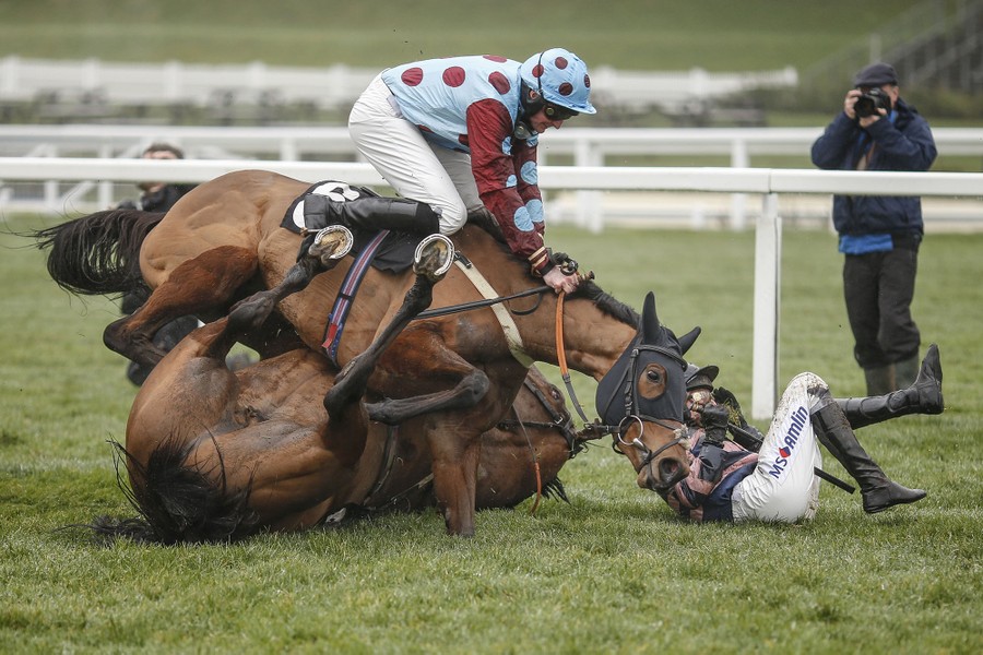 Read moreJoshua Moore riding Et Moi Alors (right) falls and brings down Harmonise and Marc Goldstein in The Horse Comes First Juvenile Hurdle Race at Ascot Racecourse in Ascot, England, on January 20, 2018. #