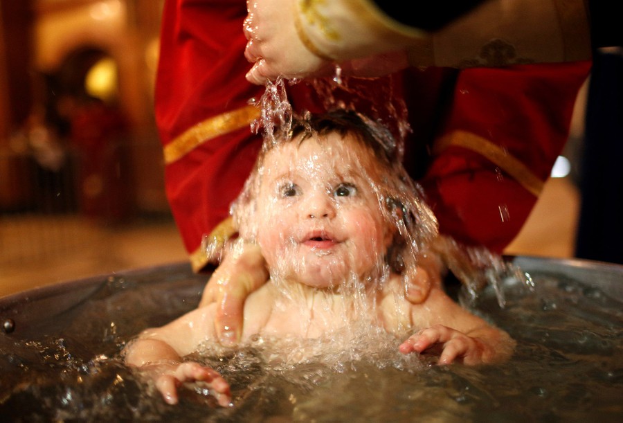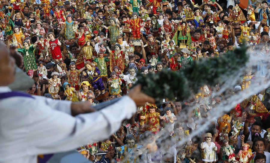Read moreRoman Catholic devotees raise their icons of the baby Jesus as they are blessed with holy water in celebration of Jesus's feast day, on January 21, 2018, in Manila, Philippines. Thousands of devotees troop to churches with their "Santo Nino," or Baby Jesus, some of which are dressed in various costumes as basketball players, firemen, police, and soldiers, for the annual procession and blessing. #
