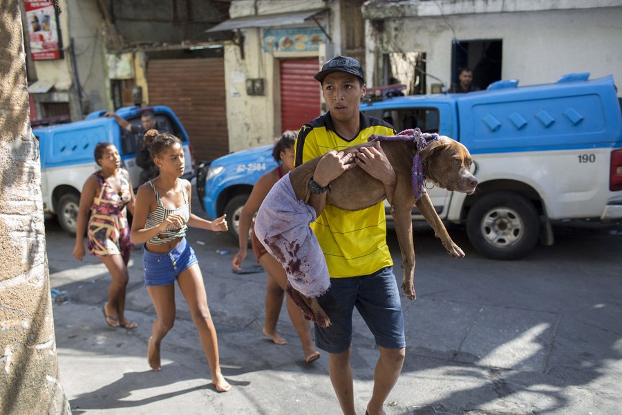 Read moreA local resident takes his dog to an emergency veterinary clinic after the animal was shot by a stray bullet during a security forces operation at the Rocinha favela in Rio de Janeiro, Brazil, on January 25, 2018. #