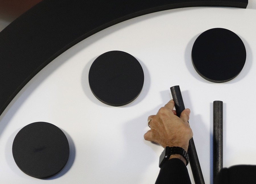 Read moreRobert Rosner, chairman of the Bulletin of the Atomic Scientists, moves the minute hand of the Doomsday Clock to two minutes to midnight during a news conference at the National Press Club in Washington, on January 25, 2018, following the group's assessment that the world is now "as dangerous as it has been since World War II." #
