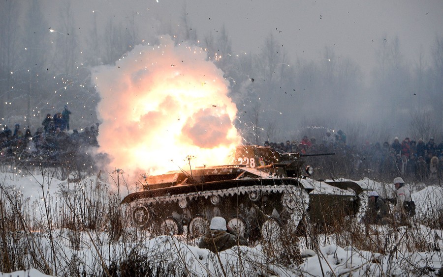 Read morePeople watch while actors dressed as World War II Soviet Red Army soldiers fight against actors dressed as Nazi German troops as they take part in the reenactment of the battle marking the 75th anniversary of the breakthrough of the Siege of Leningrad during WWII, at the memorial "Sinyavin Heights" some 60 kilometers east of Saint Petersburg, on January 21, 2018. #