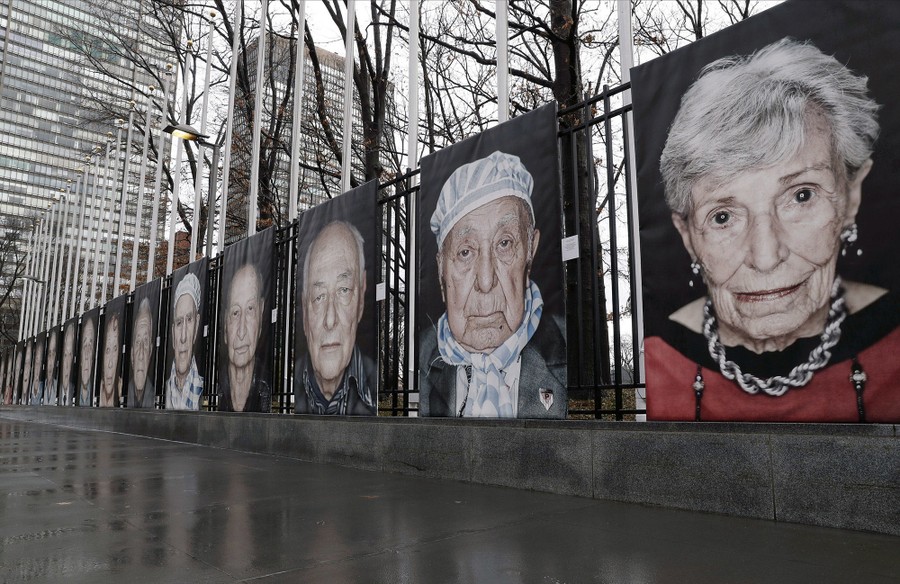 Read moreLarger-than-life portraits by Italian photographer Luigi Toscano line a fence bordering United Nations headquarters on January 23, 2018, in New York. The images are part of the exhibition Survivors, Victims and Perpetrators, in conjunction with the Lest We Forget project commemorating Holocaust victims and survivors. The UN exhibition has two parts. One focuses on the 1942 Wannsee Conference, its participants, and Nazi persecution policies leading to deportations of European Jews and their subsequent murders. The other part features Toscano's portraits of Holocaust survivors living in Germany, the United States, Ukraine, Israel, and Russia. At right is Susan Cernyak Spatz, of Vienna, who was ordered into a concentration camp in 1942 and then deported to Auschwitz-Birkenau. Spatz survived a 1945 death march to Ravensbruck, a women's concentration camp in Germany. The camp was liberated by the Russian army in 1945. #