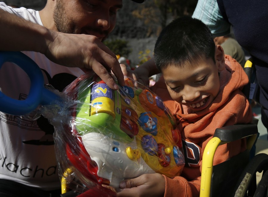 Read moreAngel Arredando hands toys to a wheelchair-bound boy at the National Pediatrics Institute in Mexico City on January 11, 2018. The Chocho Foundation gave away more than 1,800 toys to sick children at the institute. #
