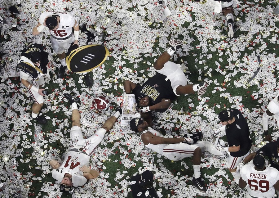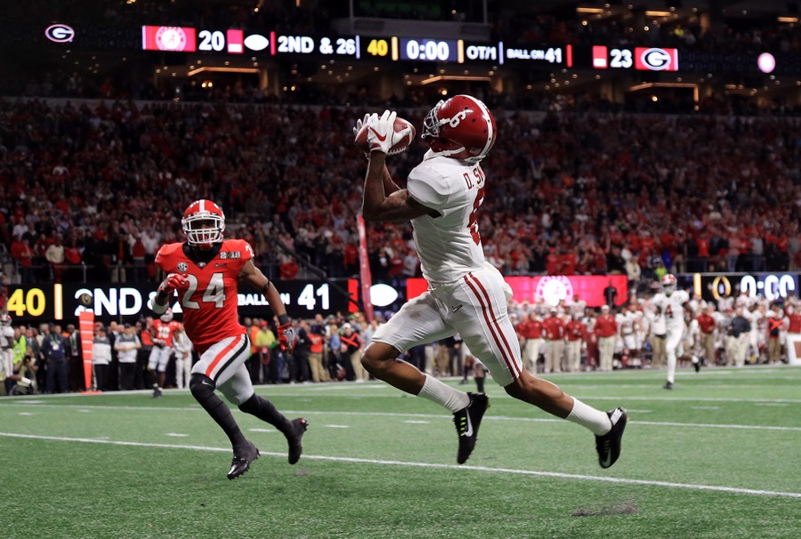 Read moreDeVonta Smith of the Alabama Crimson Tide catches a 41-yard touchdown pass to beat the Georgia Bulldogs in the CFP National Championship in overtime at Mercedes-Benz Stadium on January 8, 2018, in Atlanta, Georgia. #