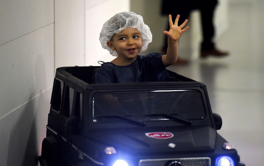 Read moreTwo-year-old Souhail waves to medical personnel as he sits in an electric toy car on his way to the operating room at the Valenciennes Hospital in Valenciennes, France, on February 2, 2018. The hospital currently owns three electric toy cars, allowing children to reduce stress before undergoing surgery. #