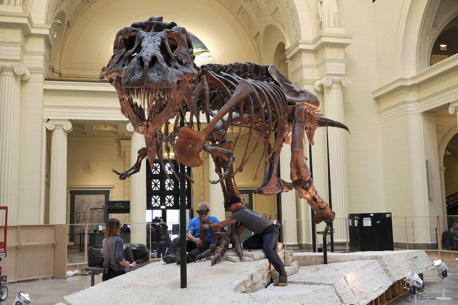 Read moreGarth Dallman, center, and Bill Kouchie, right, both from the dinosaur restoration firm Research Casting International, Ltd., begin the dismantling of Sue, the Tyrannosaurus rex on display at Chicago's Field Museum in preparation to move the towering display to a new exhibit and bring in a cast of an even larger dinosaur on February 5, 2018. Sue will appear in a new exhibition space in a second-floor gallery in 2019. #