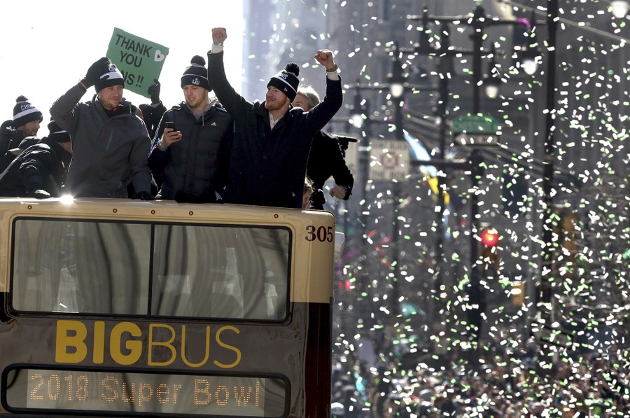 Read morePhiladelphia Eagles team quarterbacks Nick Foles, left; Nate Sudfeld, center; and Carson Wentz ride in the Eagles team parade and celebration on February 8, 2018, in Philadelphia. #