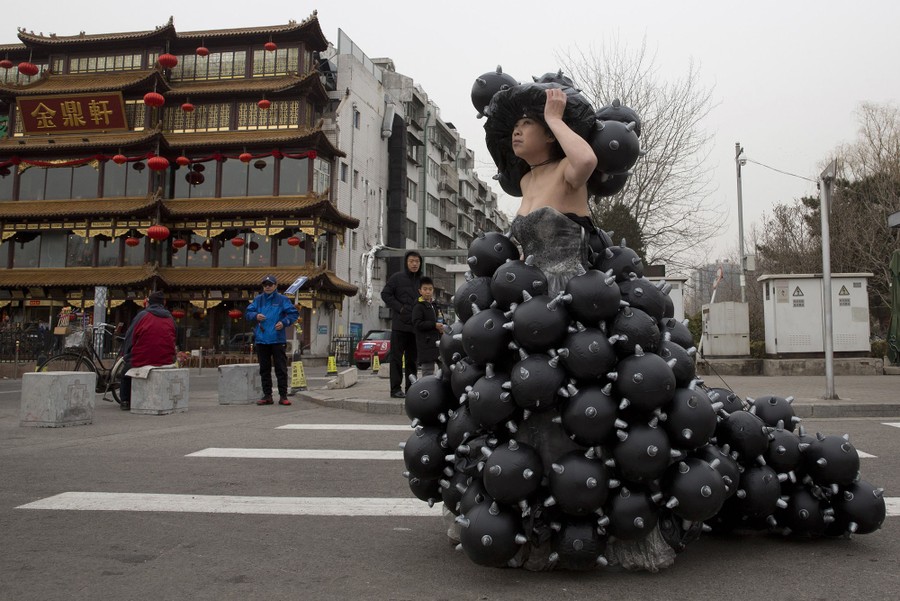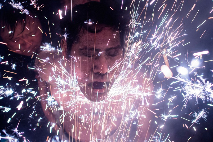 Read moreLin Xiwei, a 36-years-old shoemaker from Putian, dressed as a local deity, performs the "eating flowers" ritual in Xiaohu, Baitang, in China's Fujian province, on March 8, 2018. Working themselves into a trance, bare-chested men in eastern China lean into incandescent fountains of sparks to cleanse themselves of evil spirits and ensure a fortuitous new year. The spectacular scene takes place annually in villages such as Xiaohu in coastal Fujian province, which is home to an array of colorful centuries-old Lunar New Year rites linked to ancient customs and local gods. #