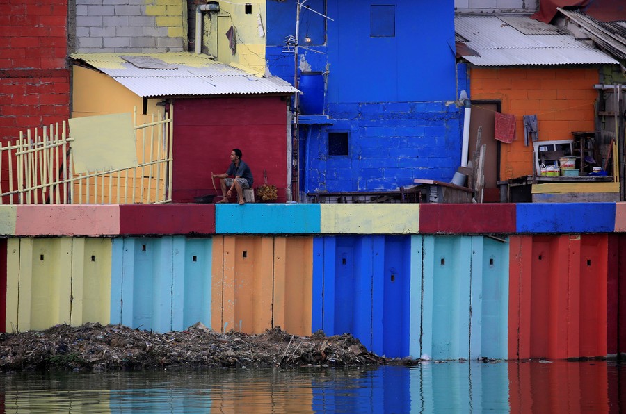 Read moreA resident cooks food in a neighborhood recently painted by the local government as part of a cleanup campaign ahead of this year's Asian Games in Sunter Jaya, Jakarta, Indonesia, on March 22, 2018. #