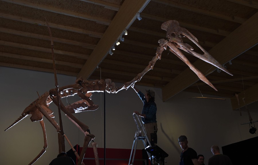 Read moreMuseum workers prepare a representation of what museum officials claim is the world's biggest discovered pterosaur prior to its exhibition at the Altmuehltal Dinosaur Museum on March 21, 2018, in Denkendorf, Germany. Bones of the unnamed pterosaur were found in the Transylvanian region of Romania and the museum has dubbed the creature "Dracula." The species is so far unnamed, though it is part of a class of ancient flying reptiles called Pterosaurs and is approximately 66 million years old. The wingspan of the reconstructed pterosaur measures 12 meters and when standing, the creature measures 3.5 meters in height. Original bones of the pterosaur are displayed in a separate display cabinet in the museum. Whether this new species could actually fly is unclear. #