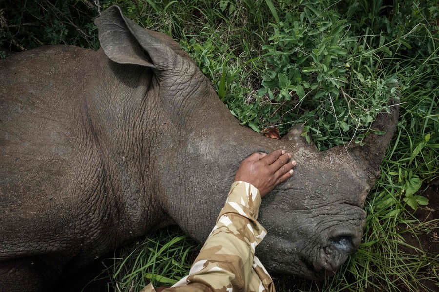 Read moreA Kenya Wildlife Services ranger covers an eye of Abby, a four-year-old female Southern white rhino, to dim the light. Abby was tranquilized during a rhino ear-notching exercise for identification at Meru National Park, 350 kilometers from Nairobi, Kenya, on April 5, 2018. #