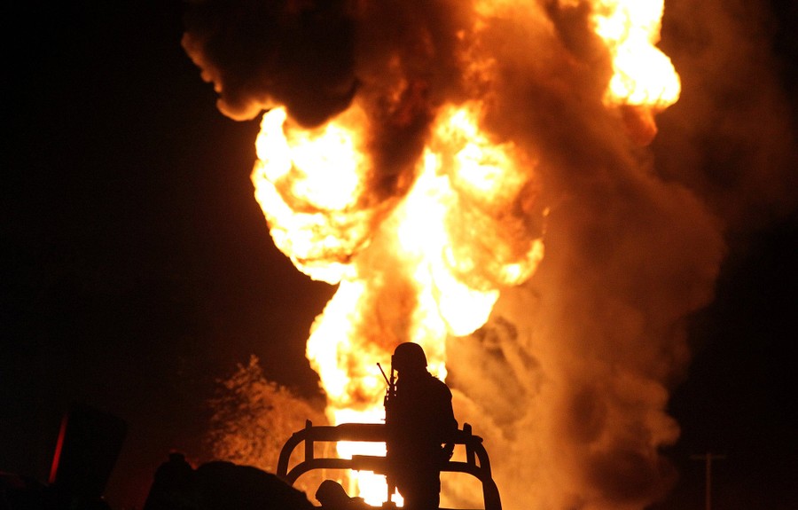 Read moreA Mexican soldier stands guard while workers of the Mexican state-owned oil company Pemex and local firefighters work to control a fire. The fire is believed to have started in a pipeline due to fuel-theft activity in the community of San Sebastianito in Tlajomulco, Mexico, on April 3, 2018. Fuel theft is becoming more common every year in Mexico as drug cartels and other gangs diversify their illegal activities. Thousands of illegal taps were discovered in pipelines in recent years. Illegal taps have caused environmental disasters and deaths in the past. #