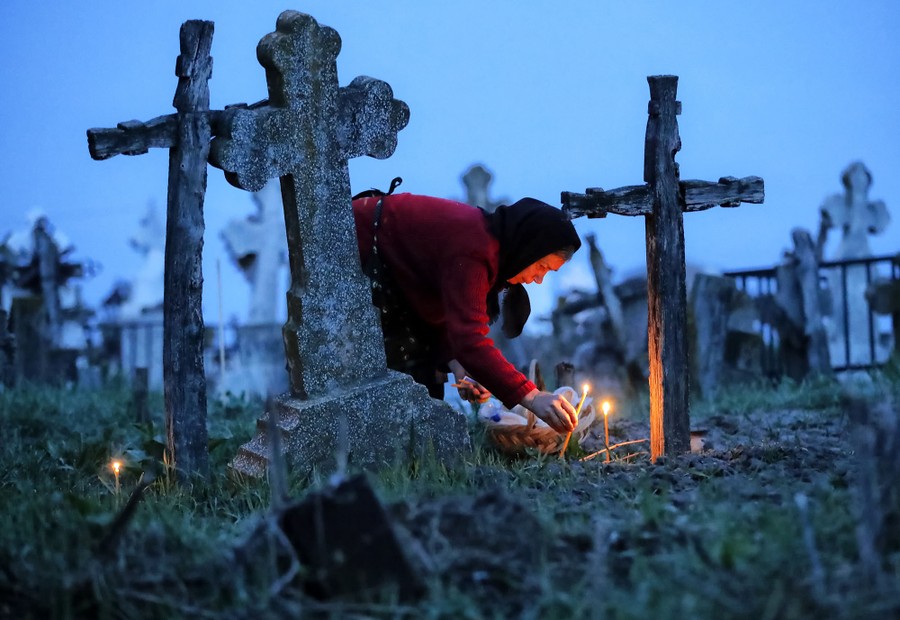 Read moreA woman lights candles next to a relative's grave at dawn in Copaciu, southern Romania, on April 5, 2018. On Maundy Thursday during Holy Week, Orthodox Christians in small southern Romanian villages go to local graveyards before sunrise as part of a centuries-old ritual. They light candles and small fires, release incense, and leave small bags of food on the ground or offer them to other people. #