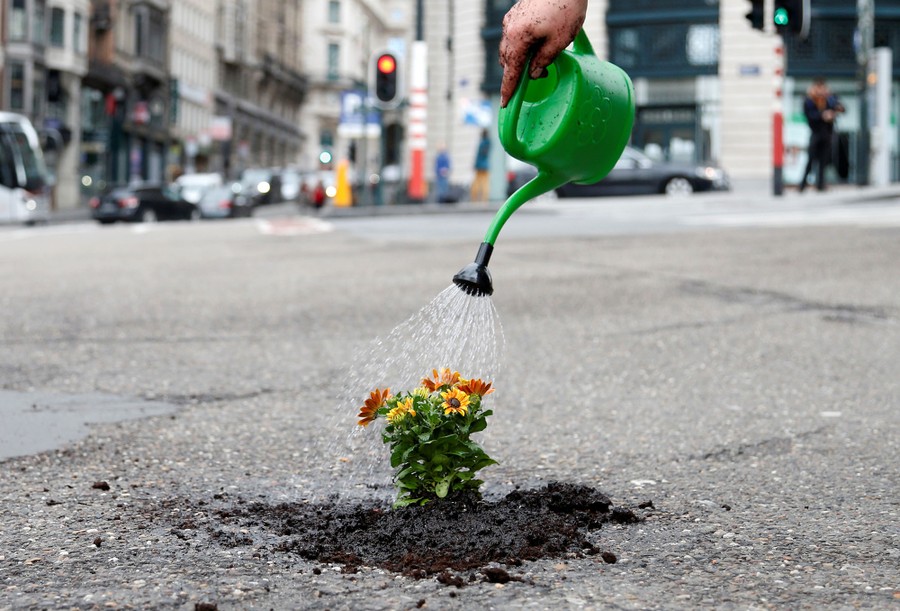 Read moreBrussels resident Anton Schuurmans waters flowers after planting them in an un-repaired pothole to draw attention to the bad state of public roads in Brussels, Belgium, on April 5, 2018. #