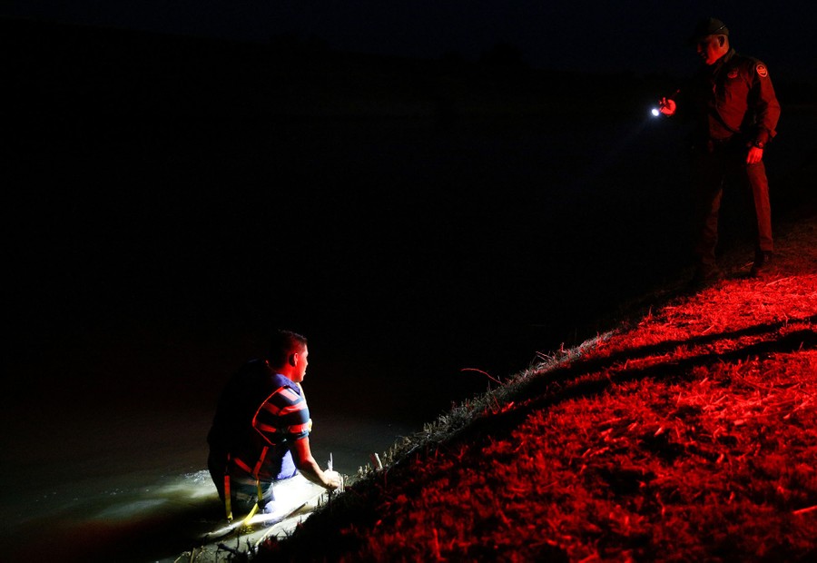 Read moreAn immigrant who jumped into a canal in an effort to escape capture after illegally crossing the Mexico-U.S. border gives up and turns himself in to a border-patrol agent in the Rio Grande Valley sector, near McAllen, Texas, on April 5, 2018. #