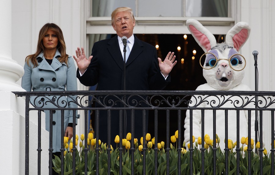 Read morePresident Donald Trump (center), joined by the Easter Bunny and First Lady Melania Trump, speaks from the Truman Balcony of the White House in Washington, D.C., on April 2, 2018, during the annual White House Easter Egg Roll. #