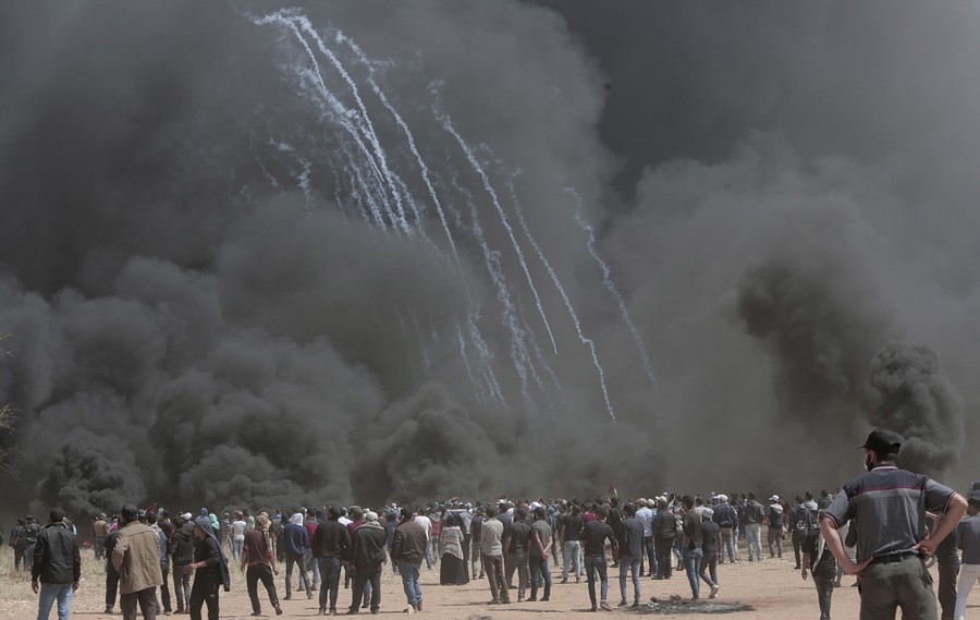 Read morePalestinian protesters gather in front of burned tires while Israeli soldiers fire teargas during clashes with Israeli troops along Gaza's border with Israel, on April 6, 2018. #